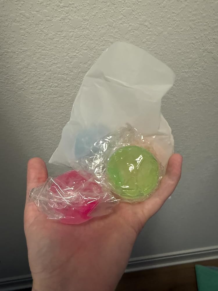 These glow in the dark balls are very fun. They are sticky, soft, and spongy - perfect for stress relief. In fact, I have them on my desk and I squish them throughout the day for stress relief. The vibrant colors are cheerful. Since they are sticky, they can pick up dirt and crumbs easily, but they are washable in water. Their stickiness resumes after they are dried. So far they seem to last. The $7 price is not bad for a set of 4 balls.