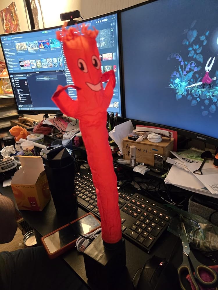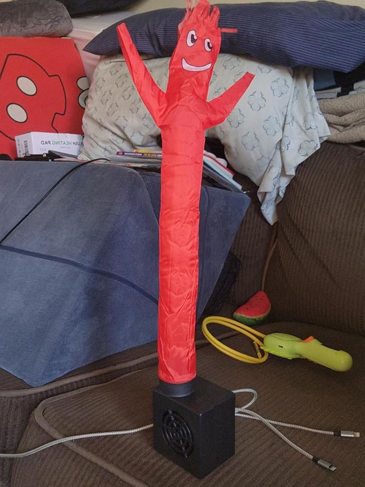 Have you ever looked at a wacky wiggling waving arm inflatable tube guy and wanted your own? Well here is your chance!This little fella is sized for a desktop and lots of fun. Plugs in easily and pops right up. The fan is loud, but it isn't the worst noise ever.The quality is great, especially considering the novelty nature of the little wiggly guy.A very fun way to add a personal, fun touch to a desk.