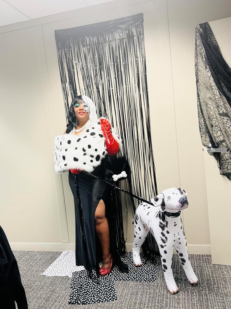 Extremely hard to blow up, but he lasted the entire day and was still up the day after Halloween when I let the air out. I couldn’t get him sturdy by myself and I had an air pump. I tried to use the pump and then just blow in him and he was still pretty boneless. Luckily my coworker came to the rescue with her mom arm and got him up using the pump. He was the perfect accessory to my cruella costume. I walked him with me around the office all day and people loved it.